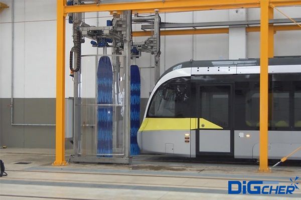 德高潔TR ATC軌道列車自動清洗機主體采用噴淋濕潤、預備洗刷、洗滌洗刷、漂洗洗刷和吹掃干燥等不同的清潔方式,配合列車勻速通過清洗工作場地除去列車表面的塵埃和污垢,達到運營列車潔凈要求。