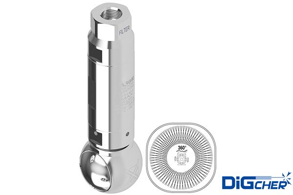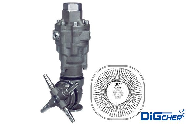 三維自動旋轉噴頭主要由不銹鋼制成,可以有效抵抗噴嘴旋轉產生的強大沖擊力。由一對錐齒輪、旋轉密封組件及液壓調速裝置等主要部件構成。進行清洗作業時,由于兩個噴管沿軸線方向具有偏心,依靠高壓水射流的反沖力使小齒輪繞著水平軸線旋轉,在經過大齒輪的嚙合作用下使旋轉密封部件沿豎直軸線旋轉。這樣就實現了三維旋轉清洗作業。